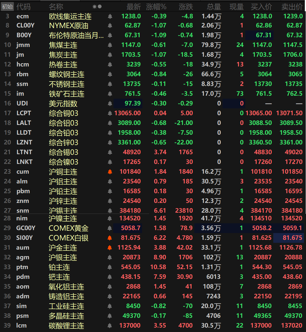 此外,碳酸锂主连涨3.55%,工业硅主连跌0.82%,多晶硅主连跌0.17%。欧线集运主连跌0.39%报1238。