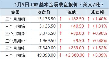 伦敦时间2月9日17:00(北京时间2月10日01:00),LME三个月期铜上涨182.5美元,或1.4%,收报每吨13,176.5美元。自1月29日创下14,527.50美元历史峰值以来,铜价已下跌10%。