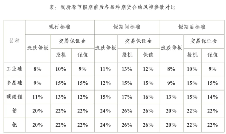 自2026年2月12日(星期四)结算时起,工业硅期货合约涨跌停板幅度调整为11%,投机交易保证金标准调整为13%,套期保值交易保证金标准调整为12%;多晶硅期货合约涨跌停板幅度调整为12%,投机交易保证金标准、套期保值交易保证金标准维持不变;碳酸锂期货合约涨跌停板幅度调整为15%,投机交易保证金标准调整为17%,套期保值交易保证金标准调整为16%;铂、钯期货合约涨跌停板幅度调整为24%,投机交易保证金标准、套期保值交易保证金标准调整为26%。