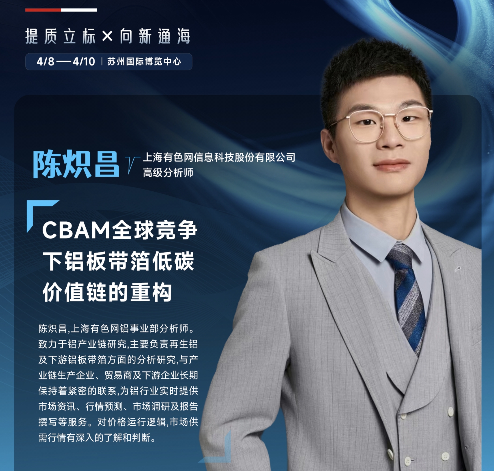 现下,绿电铝推广、再生铝高值化应用及产业链协同升级,已成为铝板带箔产业突破发展瓶颈、提升全球市场竞争力的核心路径。2026年4月8-10日,SMM AICE2026铝产业博览会将于苏州国际博览中心举办,特邀上海有色网信息科技股份有限公司高级分析师陈炽昌先生,带来《CBAM全球竞争下铝板带箔低碳价值链的重构》专题论坛,为行业破解碳关税难题、提高低碳竞争力提供实战指引。