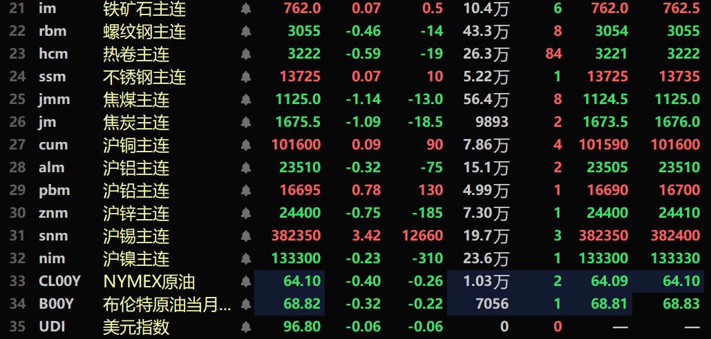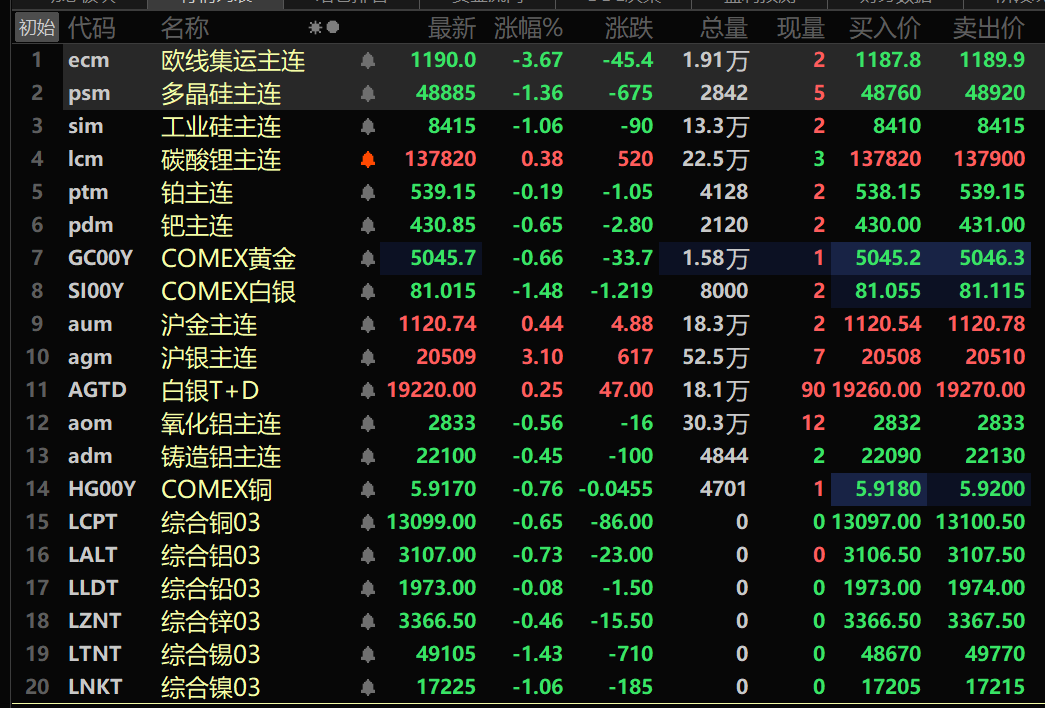 此外,截至午间收盘,铂主连期货跌0.19%,钯主连期货跌0.65%。