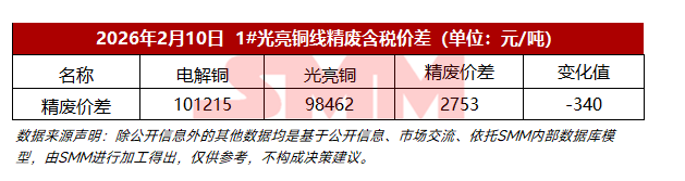2026年2月10日1#光亮铜线精废价差【SMM数据】