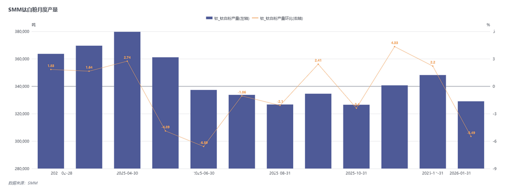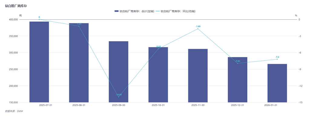 根据SMM数据显示,1月全国钛白粉产量环比减少5.49%,厂商库存环比减少7.2%。产量下调主要受1月份钛白粉企业阶段性停产检修影响;库存大幅下降则归因于两方面:一是自11月底至1月外贸订单充沛,1月多数厂商集中交付出口订单;二是春节前夕内贸备货需求集中释放,从而实现了显著去库。