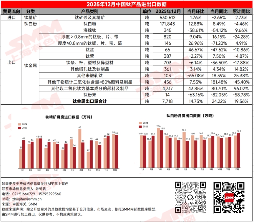 综合来看,当前钛精矿市场处于供需双弱格局,价格缺乏明确方向指引。随着春节假期临近,市场交投趋于平淡,业者普遍关注节后下游复工进度及需求恢复力度,预计市场将在节后逐步企稳并寻找新的平衡点。
