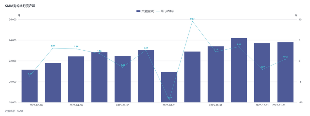 截至2月9日,0级海绵钛报价为46,000-47,000元/吨,FOB报价为6,800-7,100美元/吨。据SMM调研显示,1月海绵钛产量为2.38万吨,环比微增0.42%;2025年海绵钛累计出口量为6574吨,同比增长9.66%。此外,2025年钛金属累计出口总量较去年同期增长了19.56%。