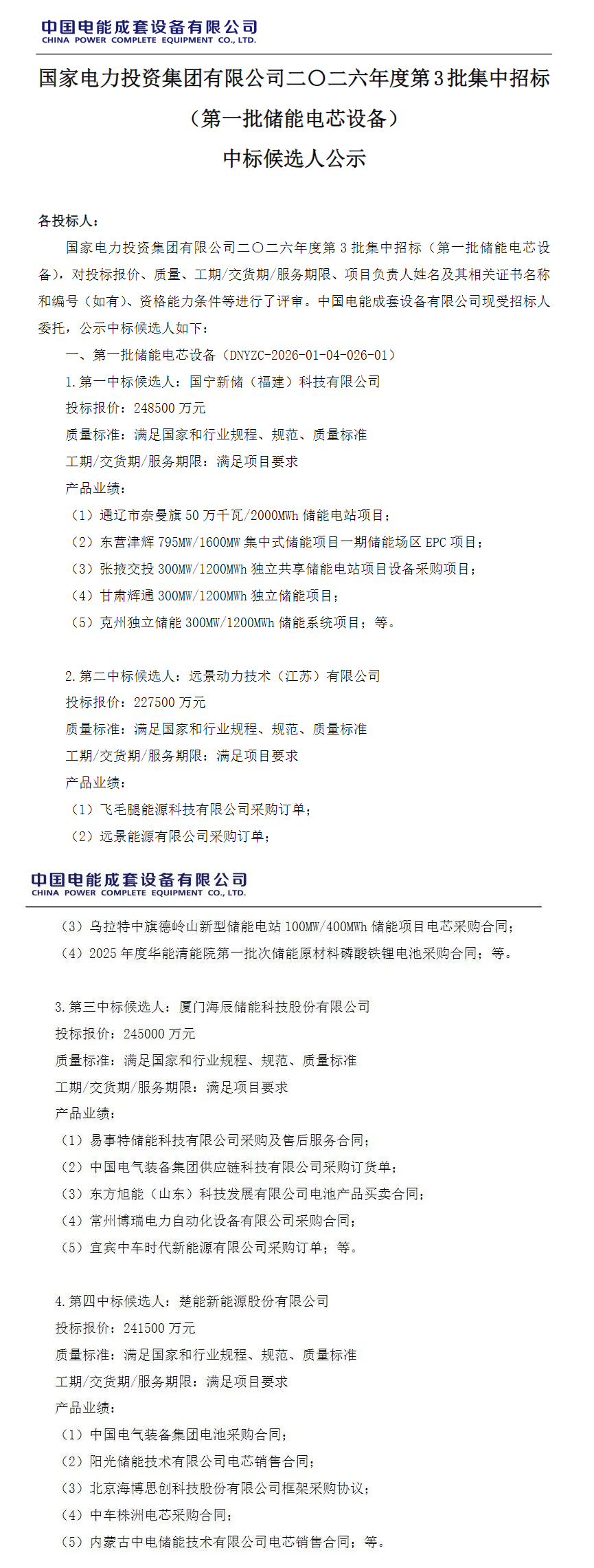 第四中标候选人为楚能新能源股份有限公司,投标报价241500万元,合单价0.345元/Wh。