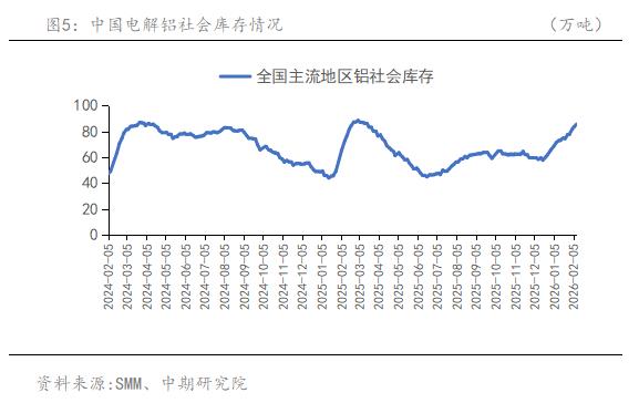 在传统消费淡季的背景下,高位铝价对下游需求的抑制作用尤为突出。与此同时,电解铝企业铝水比例的下滑,进一步放大了铝锭的现货供给压力。数据显示,1月下旬国内铝水比例环比下降2.25%至72.64%,较12月底下降3.00%,折合理论周度铸锭量增加约2.5万吨。供给增加而需求疲软,导致全国铝锭社会库存自1月下旬以来持续累积。截至2026年2月9日,国内铝锭社会库存已达到85.7万吨,较2025年同期大幅增加12.8万吨。若后期铝价维持高位且铝锭持续流入仓库,预计春节后全国铝锭社会库存高点可能攀升至130-150万吨左右,创下近年新高,届时高库存成为压制市场的关键因素。