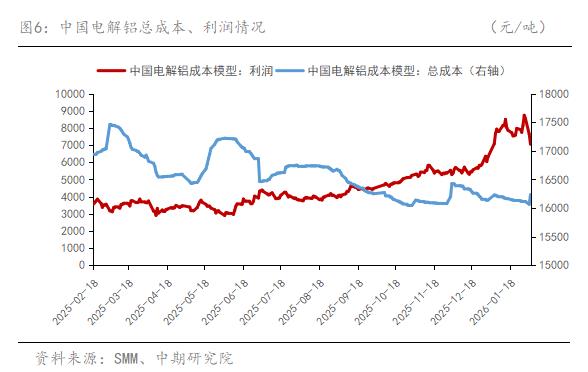 当前市场压力主要来自三方面。首先,高库存与弱需求构成核心压制。目前国内铝锭社会库存处于近三年同期高位,且春节淡季效应显著,高铝价进一步抑制了下游采购意愿。其次,推动前期涨势的宏观情绪与资金驱动正在减弱,且美元走强预期对有色金属板块形成压制。最后,地缘政治等宏观不确定性仍是潜在扰动因素。但铝价下方也存在多重坚实支撑,将限制其下跌空间。最根本的支撑来自国内电解铝产能已接近政策天花板,产能利用率高达97%,供应弹性极小,短期供应端难以释放大量增量。其次,虽然氧化铝等原料价格走弱导致成本下移,但电解铝行业利润仍处历史高位,这巩固了高成本产能的成本线支撑。此外,铝的长期战略价值重估逻辑以及全球绿色转型带来的结构性需求,共同奠定了其中长期向好的基础。