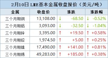 伦敦时间2月10日17:00(北京时间2月11日01:00),LME三个月期铜下跌68.5美元,或0.52%,收报每吨13,108.0美元。