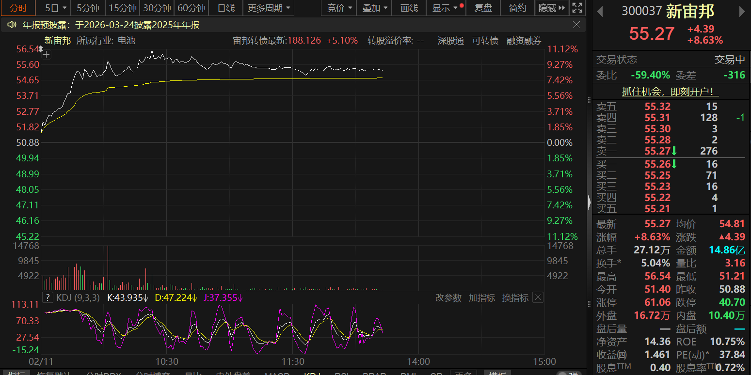 业绩报告发布之后,2月11日新宙邦股价盘中快速拉涨,股价一度涨逾11%,截至13:42分,新宙邦以8.63%的涨幅报55.27元/股。