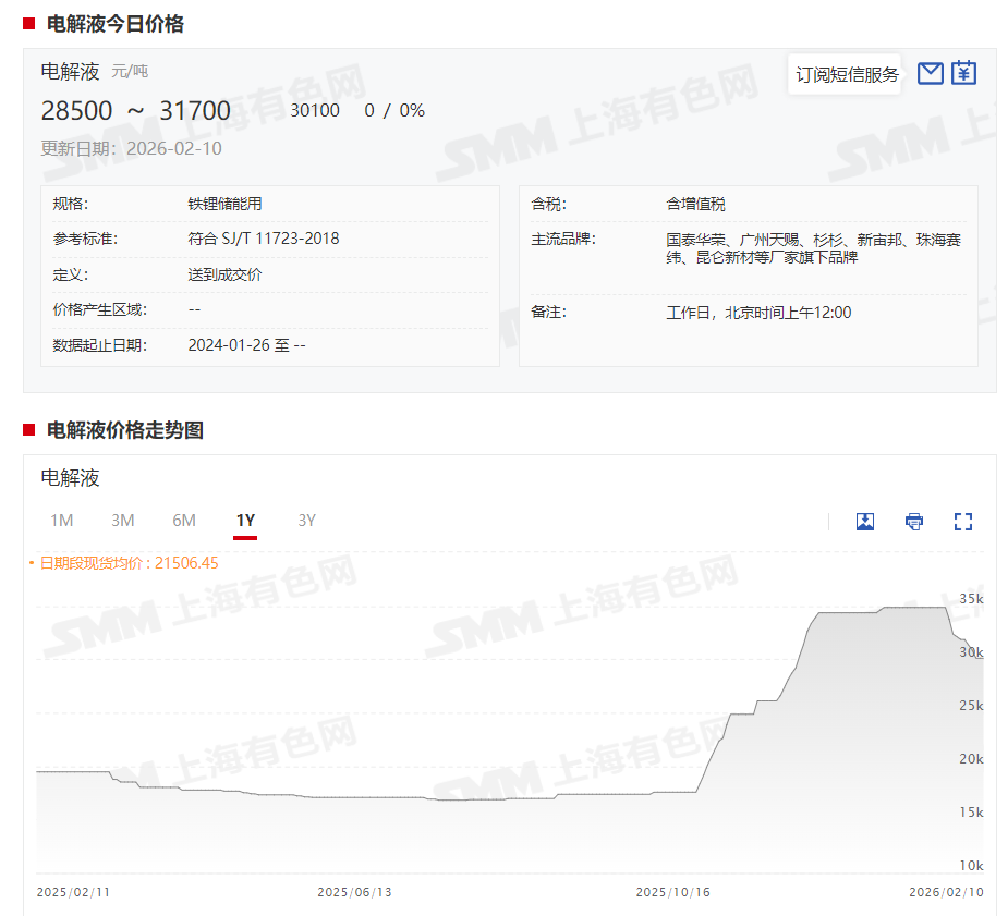 据SMM历史价格显示,以磷酸铁锂用电解液为例,其报价自8月份以来开始逐步上行,截至2026年1月5日,其现货均价涨至35750元/吨,刷新2023年3月以来的新高。