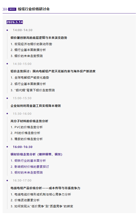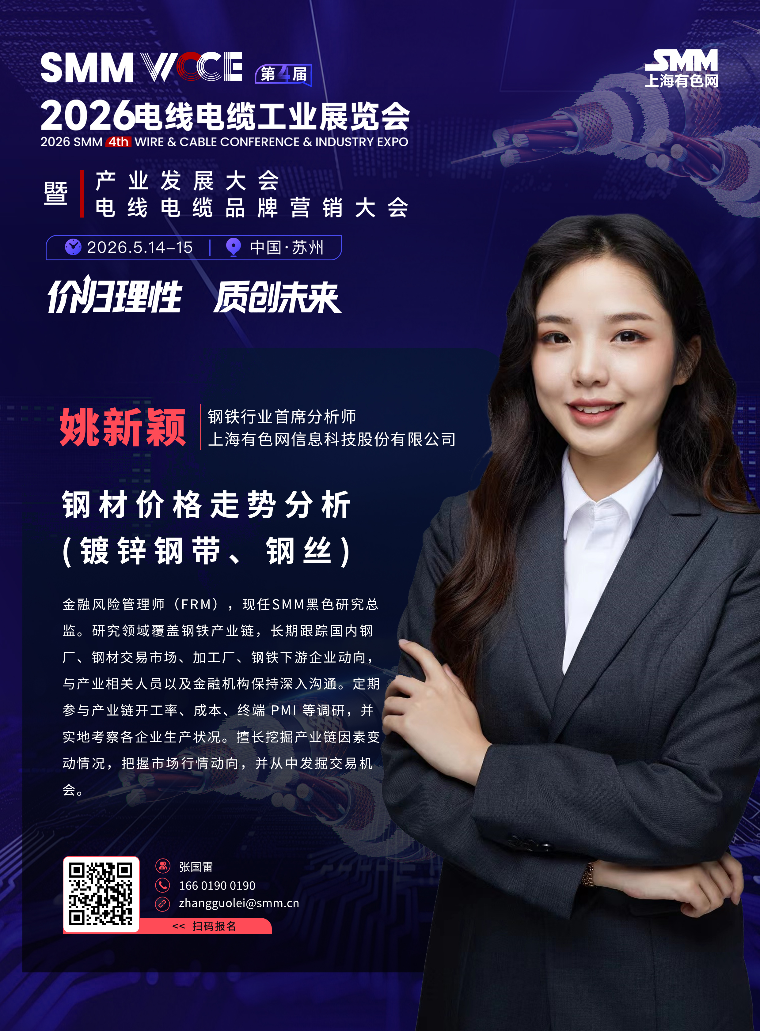 在此行业变革节点,SMM WCCE 2026电线电缆展将于2026年5月14-15日在苏州举办,特邀金融风险管理师(FRM)、上海有色网黑色研究总监姚新颖,带来《钢材价格走势分析(镀锌钢带、钢丝)》专题分享。作为深耕钢铁产业链的专家,姚新颖长期跟踪钢铁产业链各环节动向,与产业及金融机构深入沟通,定期参与产业链调研、实地考察企业生产,擅长挖掘产业链变动规律、把握行情并发掘交易机会,对钢铁价格波动逻辑有深刻洞察。这场分享将围绕钢铁行业基本面、钢材价格影响要素、未来走势预测三大核心,结合镀锌钢带、钢丝特点,为相关企业把握价格走势、优化决策、规避风险提供实操参考。