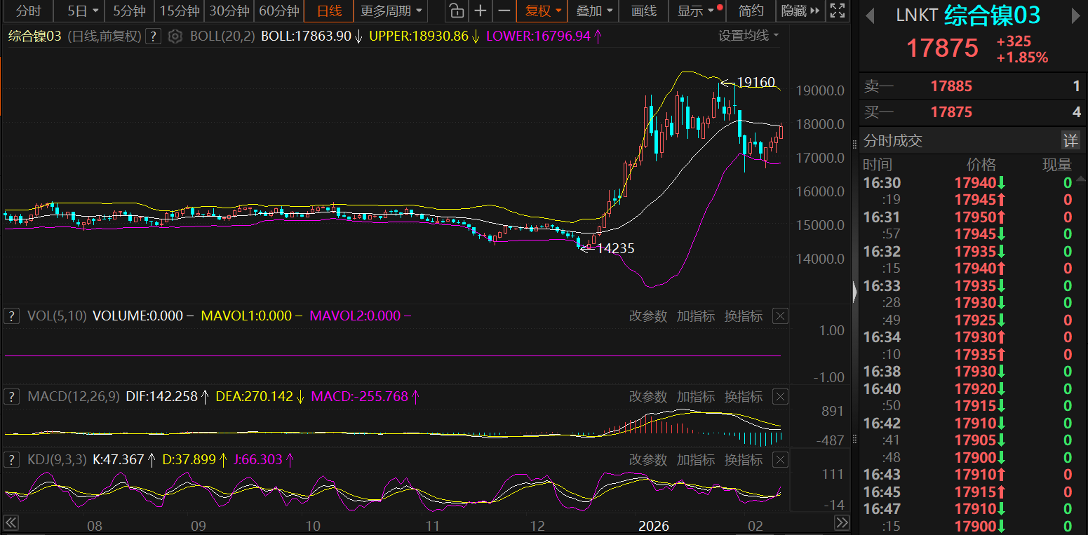 伦镍方面价格一同上涨,截至16:50分,伦镍以1.85%的涨幅报17875美元/吨。