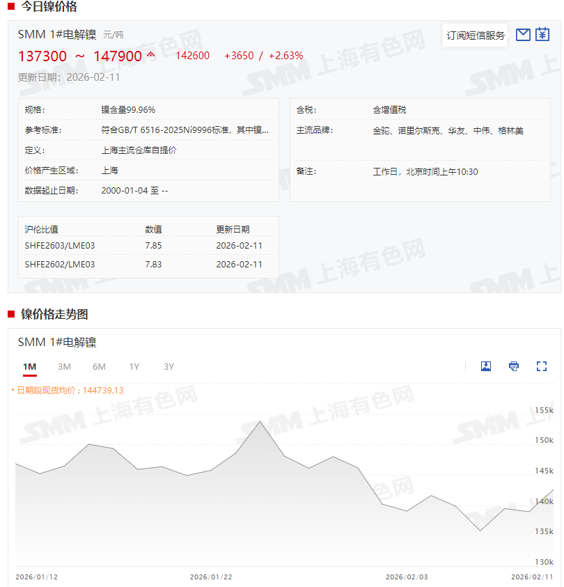 现货价格方面,据SMM现货报价显示,截至2月11日,SMM 1#电解镍单日上涨3650元/吨,报137300~147900元/吨,均价报142600元/吨。