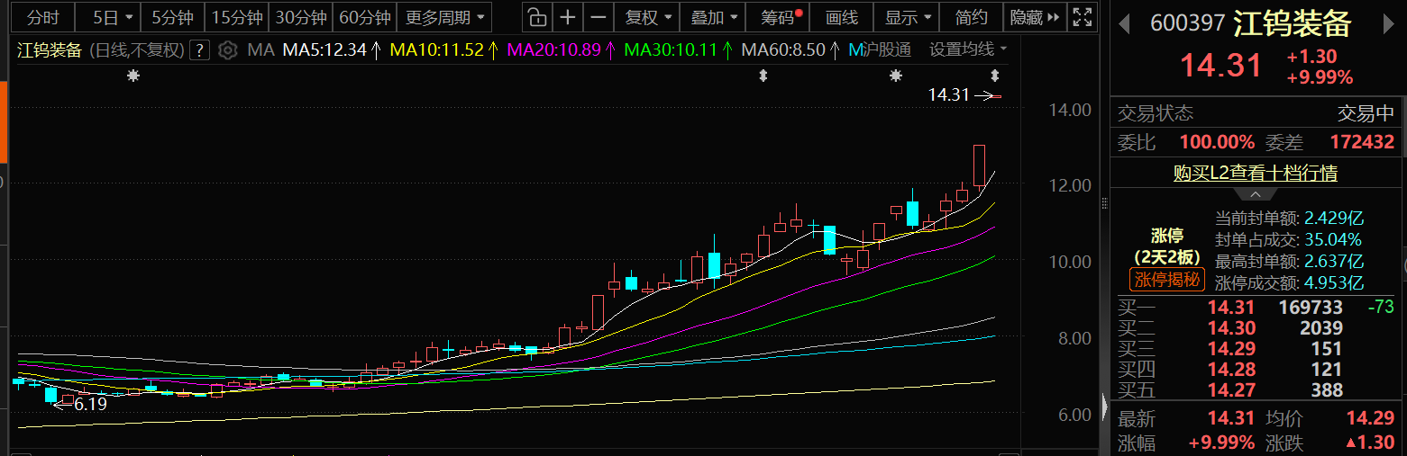 2月12日,江钨装备收获两连板,截至12日11:11分,江钨装备涨9.99%,报14.31元/股。