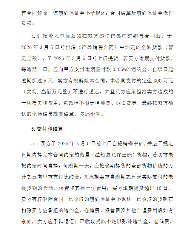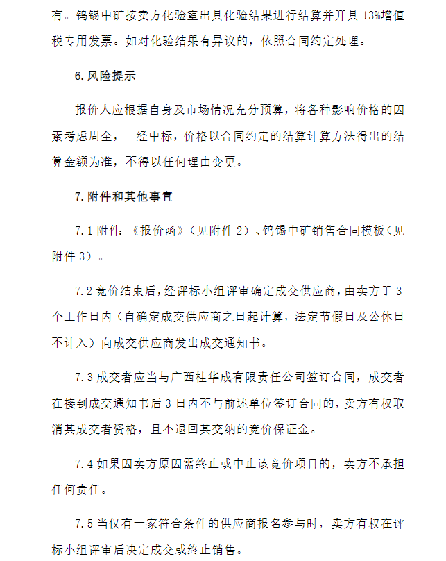 广西一矿山竞价招标销售钨锡中矿约123.33实物吨(钨品位约为29.12%,锡品位约为13.79%),竞价截止时间为2026年2月13日下午15时30分整。有意向者请联系白先生:188-7749-6428,或登录网站https://ecp.cnmc.com.cn/bidBulletin/2026-02-11/339420.html了解详情及参与投标,以网站竞价文件为准。