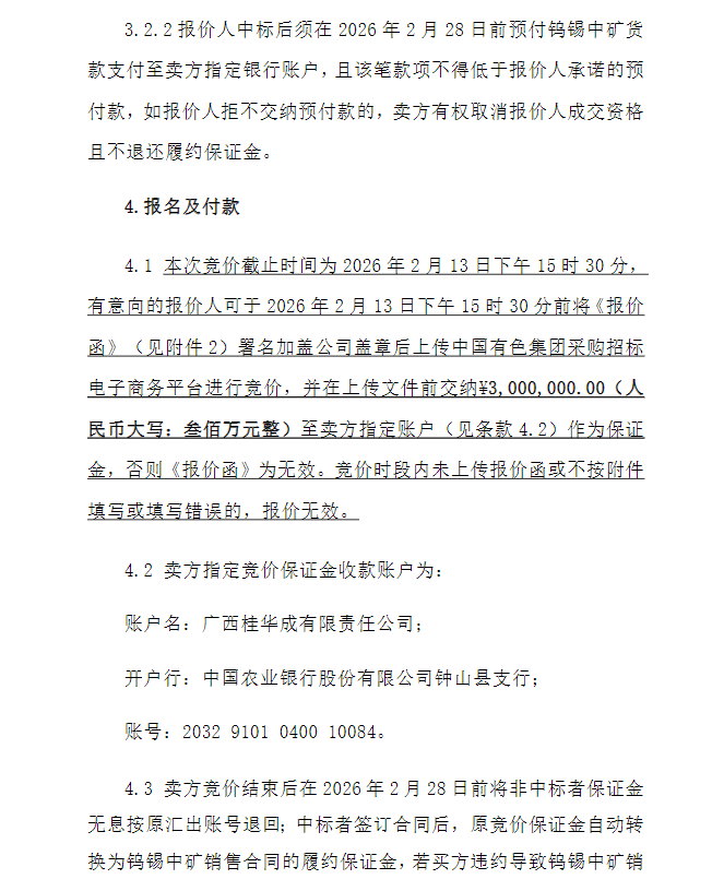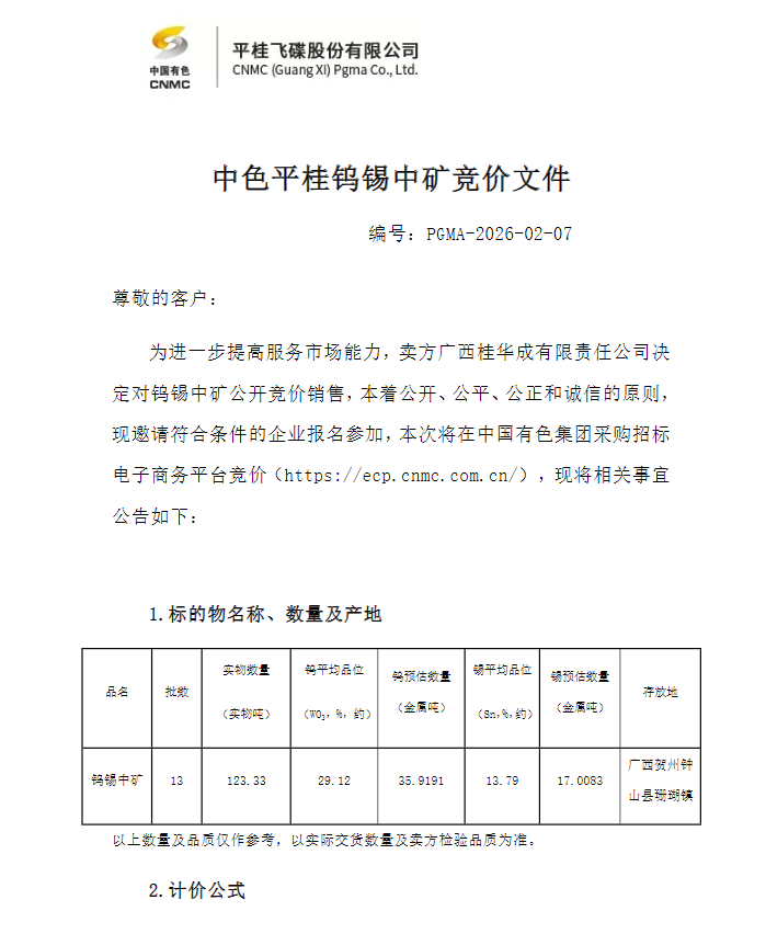 欲知更多详情,请点击公告原文:》中色平桂2026年2月份钨锡中矿公开竞价销售公告