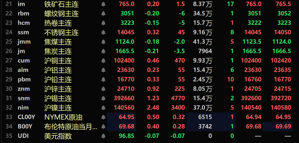 截至午间收盘,内盘基本金属全线上涨,沪铜涨0.46%。沪铝涨0.23%。沪铅涨0.23%,沪锌涨0.92%。沪锡涨1.23%,沪镍涨2.48%。