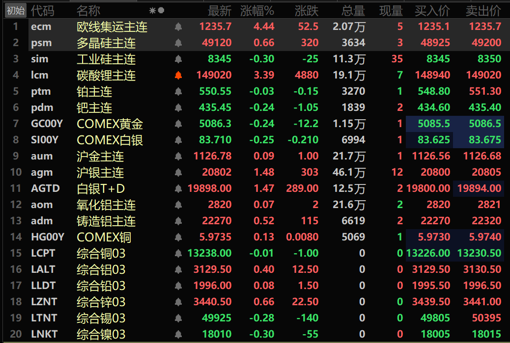 此外,铸造铝主连期货涨0.52%,氧化铝主连涨0.07%。碳酸锂主连涨3.39%。工业硅主连跌0.3%。多晶硅主连涨0.66%。