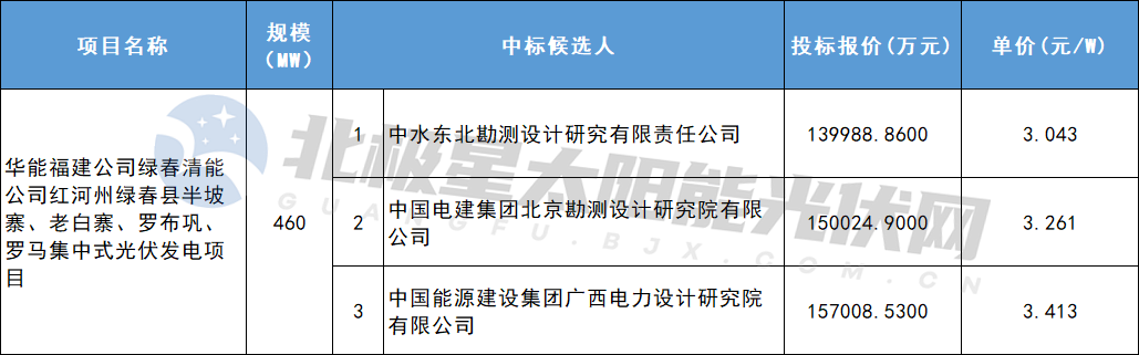 2月10日,华能福建公司绿春清能公司红河州绿春县半坡寨、老白寨、罗布巩、罗马集中式光伏发电项目EPC招标候选人公示,入围企业有3家:中水东北勘测设计研究有限责任公司、中国电建集团北京勘测设计研究院有限公司、中国能源建设集团广西电力设计研究院有限公司,投标单价3.043~3.413元/W。