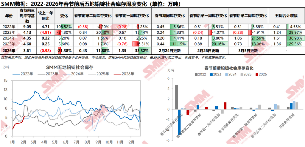 2022-2026年春节前后铅锭五地社会库存变化(2月12日更新版)【SMM数据】