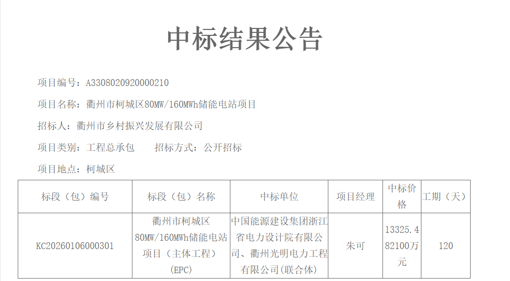 北极星储能网获悉,2月11日,浙江衢州市柯城区80MW/160MWh储能电站项目EPC中标结果公告,中标单位为中国能源建设集团浙江省电力设计院有限公司、衢州光明电力工程有限公司(联合体),中标价格为13325.482100万元,约合单价0.833元/Wh。