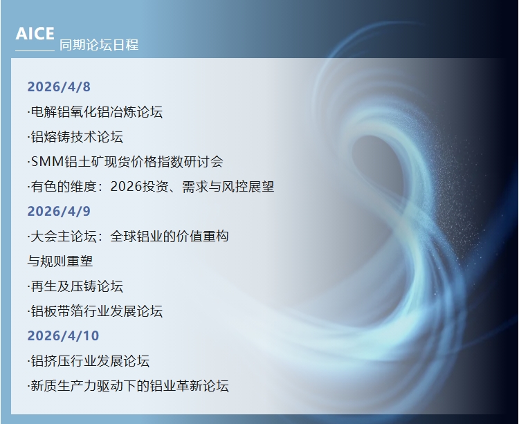 由上海有色网信息科技股份有限公司(SMM)主办的AICE 2026铝业大会暨铝产业博览会将于4月8日至10日在苏州国际博览中心盛大启幕。本届展会以“提质立标·向新通海”为主题,设置铝上游、铝压延铝板带箔、铝挤压管棒线型、再生回收、压铸、铝熔铸设备及辅材六大特色展区。同期举办CLNB新能源产业博览会,打造覆盖铝+新能源全产业链的生态闭环。