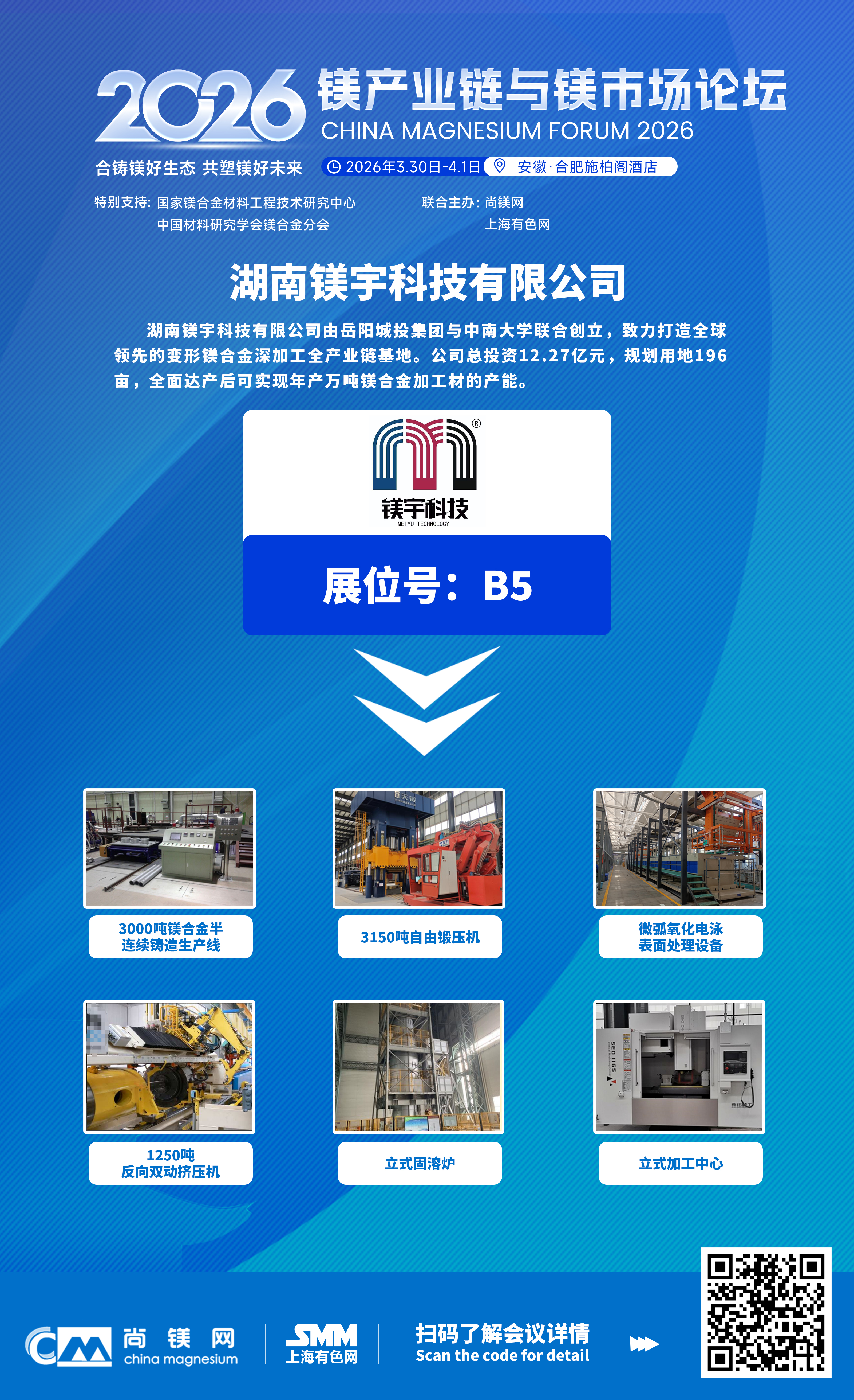 上海有色网(SMM)和尚镁网诚邀您参与于2026年3月30日 - 4月1日举行的2026镁产业链与镁市场论坛,湖南镁宇科技有限公司将隆重出席此次大会,我们将与时代同步,瞄准目标,踔厉奋发,勇毅前行!