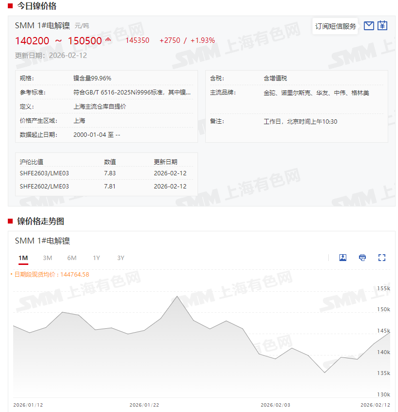 截至2月12日,SMM 1#电解镍现货报价涨至140200~150500元/吨,均价报145350元/吨,两日累计上涨6400元/吨。
