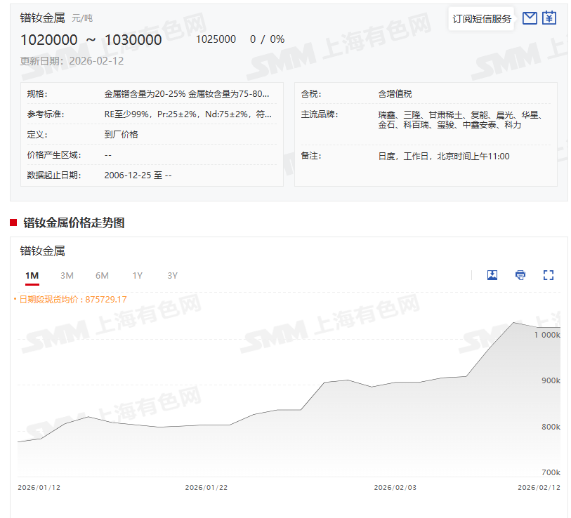 据SMM报价显示,2月12日,镨钕金属价格为1020000~1030000 元/吨,其均价为1025000元/吨,均价较前一交易日持平。当前,稀土市场价格总体保持平稳态势。聚焦镨钕市场,春节假期临近,上下游企业普遍提前进入假期模式,生产企业报价意愿降低,市场交易氛围清淡,价格未出现显著波动。综合来看,随着春节假期的临近,上下游生产企业大多已提前放假,市场整体交易活跃度较低,价格保持平稳。预计在春节前,由于市场交易活动减少,稀土价格将继续维持平稳运行态势。