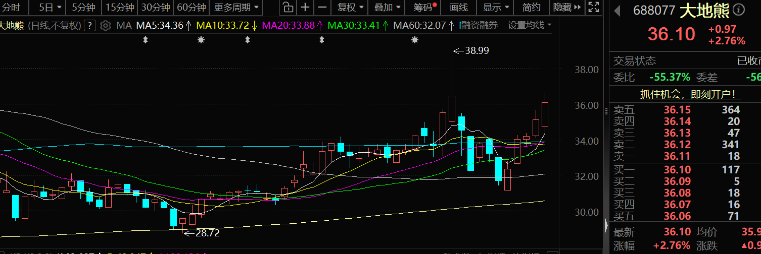 2月12日,大地熊股价出现上涨,截至2月12日收盘,大地熊涨2.76%,报36.1元/股。