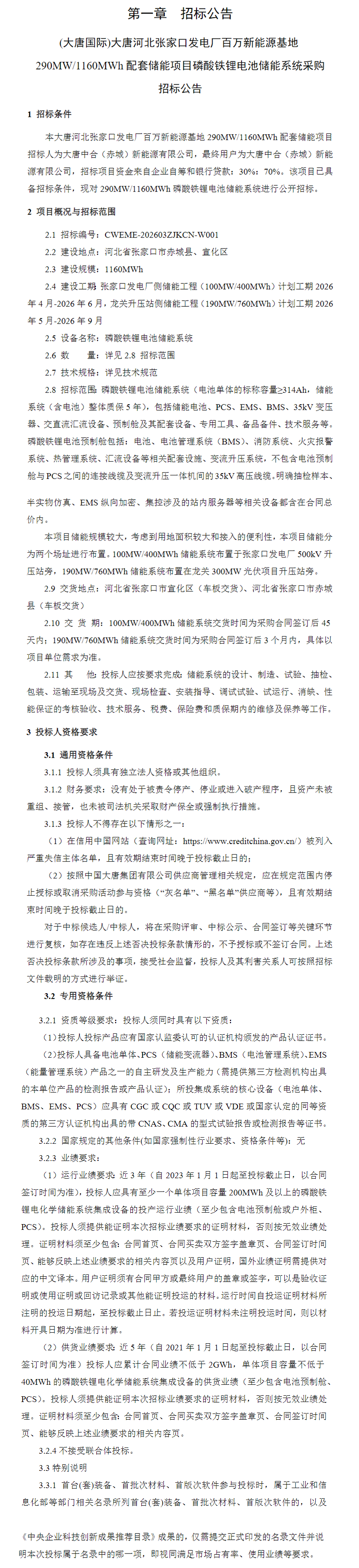 北极星储能网讯:2026年2月10日,大唐河北张家口发电厂百万新能源基地290MW/1160MWh配套储能项目发布磷酸铁锂电池储能系统采购招标公告,建设地点为河北省张家门市赤城县、宣化区。