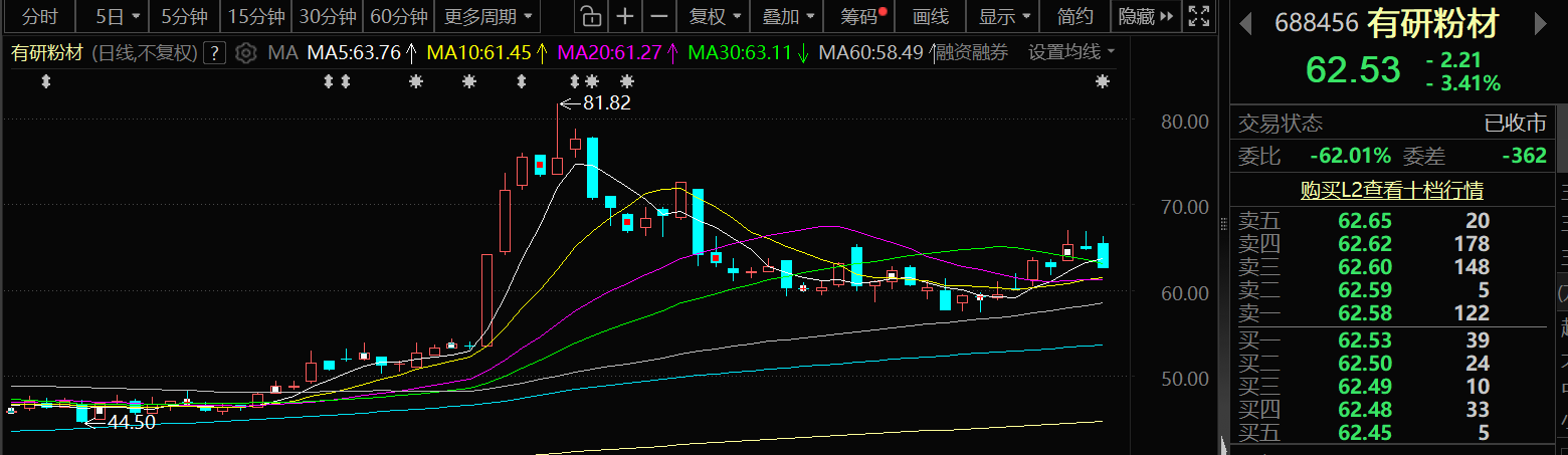 2月13日,有研粉材股价出现下跌,截至13日收盘,有研粉材跌3.41%,报62.53元/股。