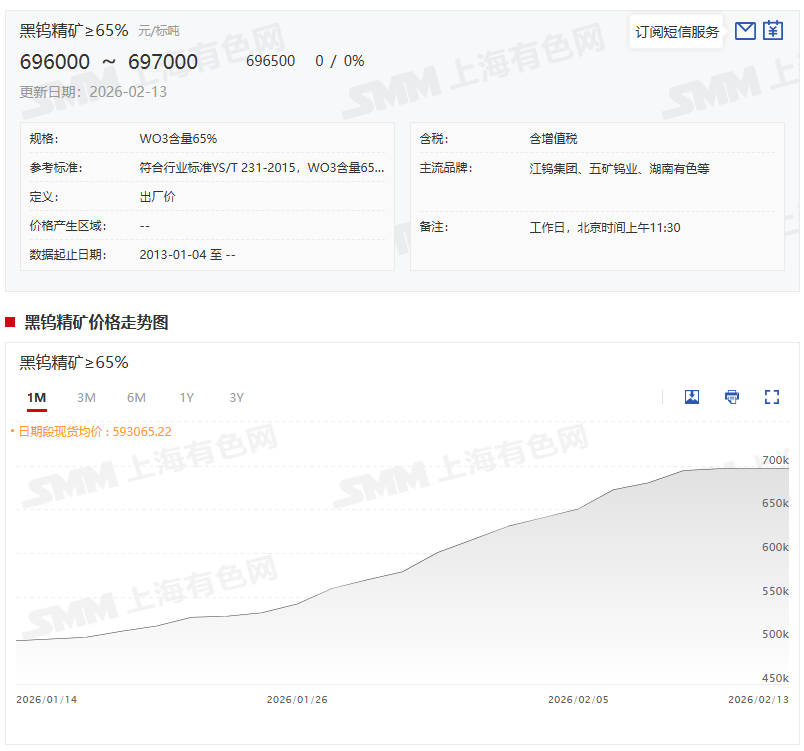 而进入2026年以来,钨价延续了2025年以来的上涨态势,近来更是迭创历史新高!据SMM报价显示,2月13日,黑钨精矿(≥65%)价格为696000~697000元/标吨,均价报696500元/标吨,与其前一交易日持平!而696500元/标吨这一均价新高与2025年12月31日的均价453500元/标吨相比,其均价今年以来上涨了243000元/标吨,今年以来的涨幅为53.6%。