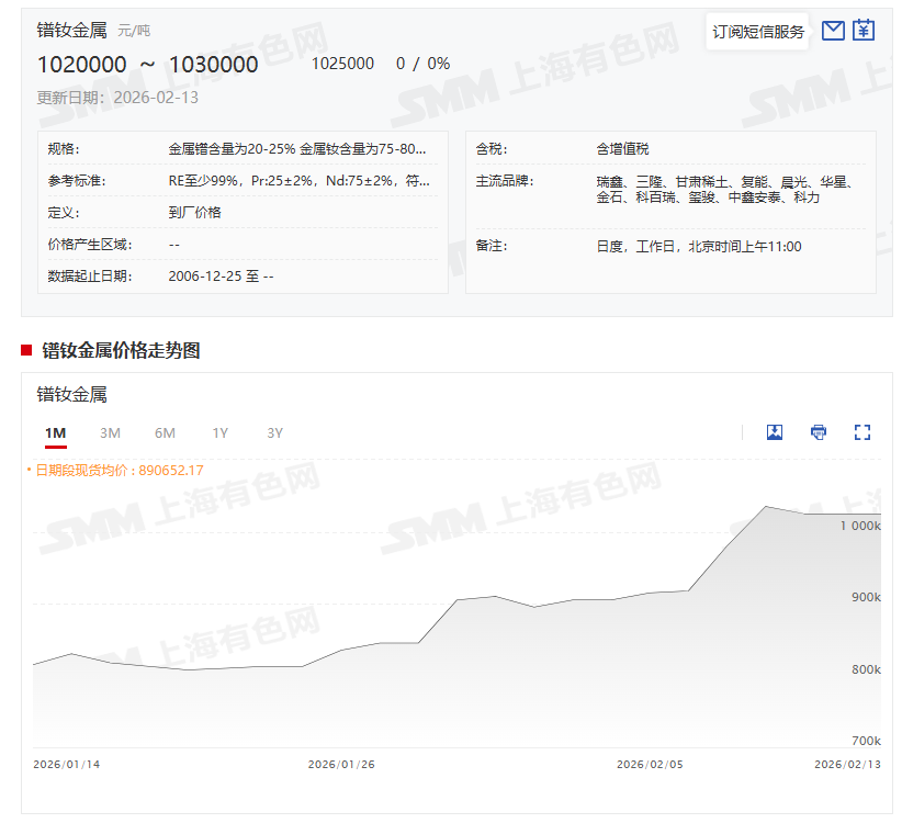 据SMM报价显示:2月13日,镨钕金属价格稳定在102-103万元/吨。当前,稀土市场价格维持平稳态势。由于春节假期临近,稀土产业链上下游企业大多已进入假期模式,下游磁材企业纷纷暂停采购活动,导致市场整体询单量显著减少,氛围冷清。与此同时,多数生产企业也选择暂停报价,稀土价格因此未出现明显波动。展望春节前后,受市场交易活跃度降低的影响,稀土价格预计将继续保持在高位运行。