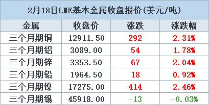 伦敦时间2月18日17:00(北京时间2月19日01:00),LME三个月期铜上涨2.31%或292美元,收报每吨12,911.50美元。盘中该合约曾上涨至每吨12,941美元。周二该合约下跌1.8%,触及自2月6日以来的最低水平。