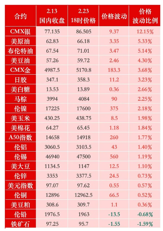 对于春节假期外盘表现,格林大华期货首席专家王骏概括为“普涨、分化、波动加剧”三大特征。他认为,大部分商品价格上涨行情是受美伊冲突等宏观因素驱动,能源板块整体上涨显著,贵金属板块也受此影响录得明显上涨。