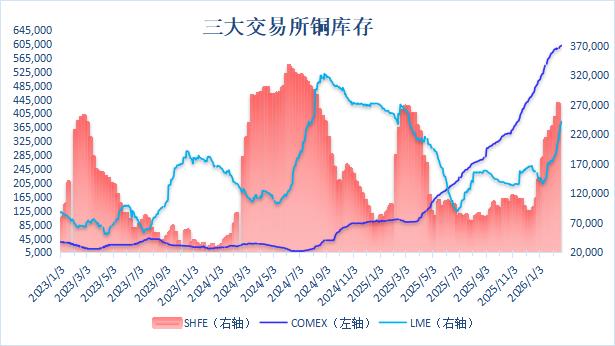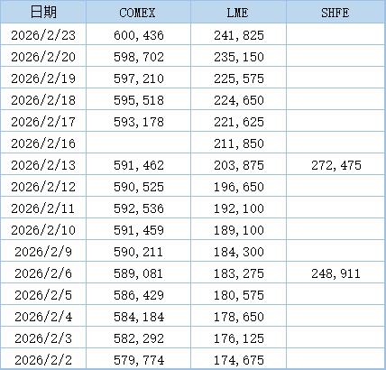 以下为2026年2月以来三大交易所铜库存数据:(单位:吨)