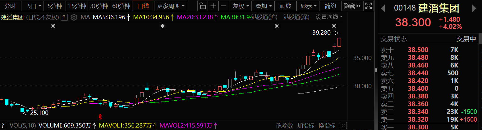 2月24日,建滔集团股价出现上涨,截至24日10:54分,建滔集团涨4.02%,报38.3元/股。