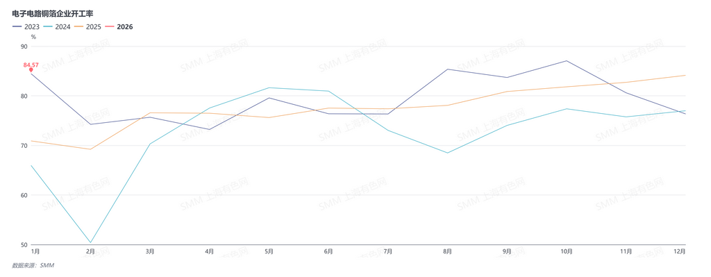 据SMM,2026年1月中国铜箔企业的开工率同环比均上升。 2026年1月铜箔行业开工率迎来开门红,实现连续第9个月的持续攀升。一方面,由于1月铜价重心继续攀升,推动了下游下单;另一方面,春节节点临近,下游陆续进行备货动作。从终端需求来看,动力端需求出现季节性回落;储能端行业延续高景气度,呈现出“淡季不淡”状态,在“630”并网节点与海外需求的双重驱动下,电池产量环比实现微增;国补新政支撑消费电子需求,AI服务器等高端产业热度不减。 SMM预计2月受春节节点影响,中国铜箔企业开工率将出现回落。》点击查看详情