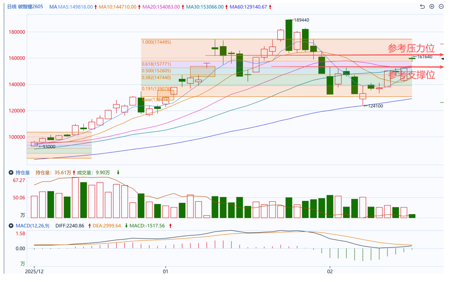 从盘面观察,碳酸锂主力合约LC2605今日开盘向上跳空,一举站上短期所有主流均线,站稳于前期缺口之上(1月12日最低价),且资金也呈现小幅回流迹象,MACD指标有望在零轴上方形成金叉。上方关键压力位参考1月13日最低价161,540元附近,支撑参考2月13日最高价146,920元附近,在下方短线支撑未失守前,技术上短期碳酸锂或有望震荡偏强运行。