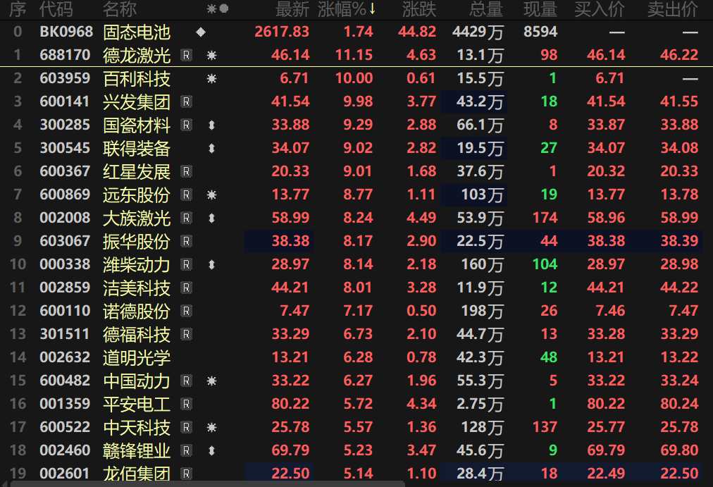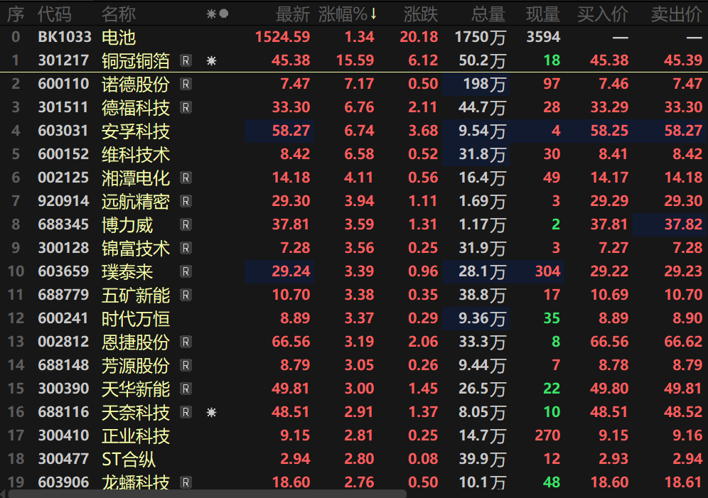 电池个股方面,铜冠铜箔涨逾14%,安孚科技、诺德股份、德福科技等多股涨逾6%;固态电池个股方面,德龙激光涨逾12%,百利科技盘中涨停,兴发集团、联得装备、国瓷材料、红星发展、中国动力等多股盘中一同涨逾7%。