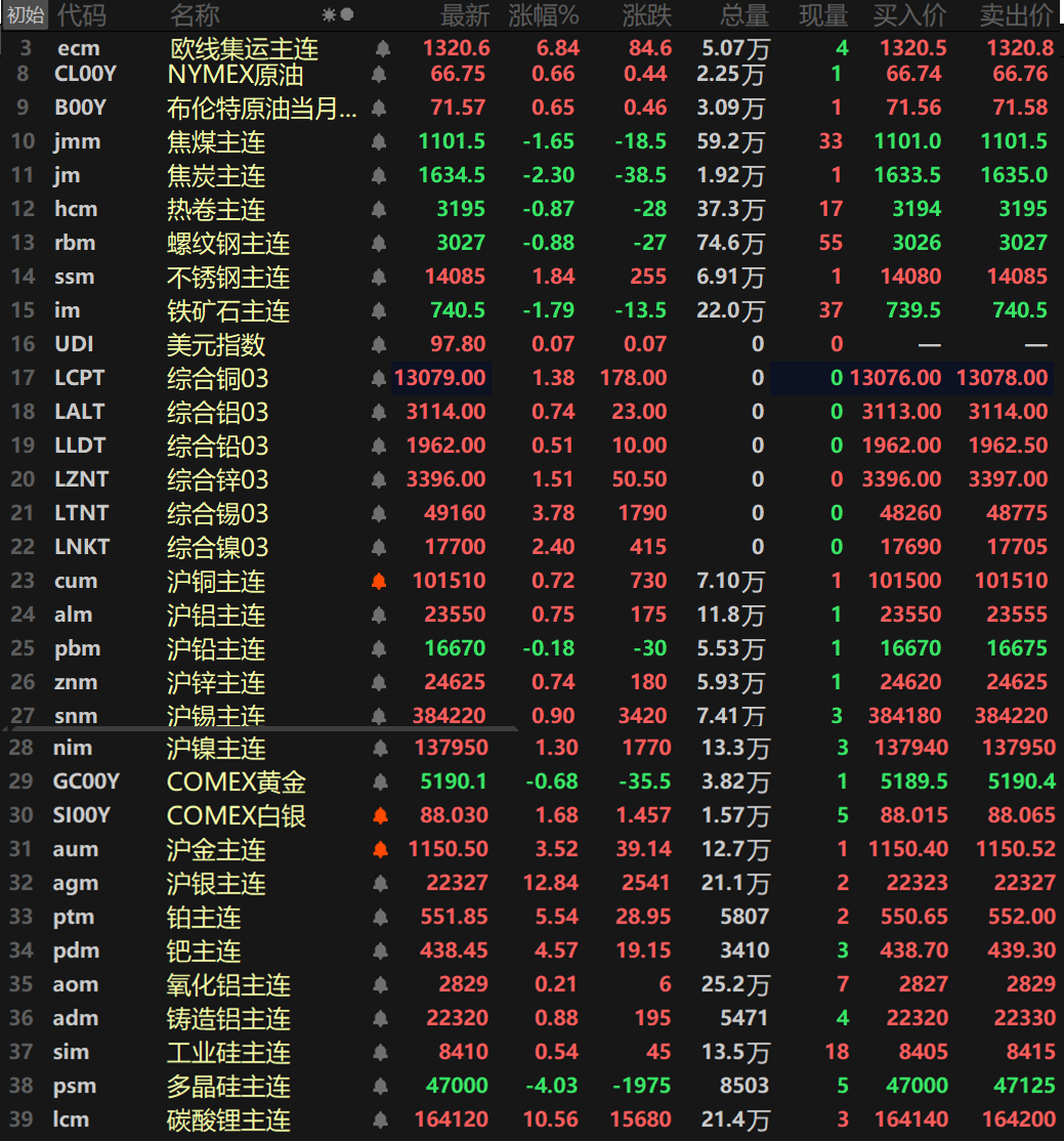 此外,碳酸锂主连临近收盘涨幅扩大至10.56%,多晶硅跌4.03%,工业硅涨0.54%,欧线集运主连涨6.84%报1320.6。