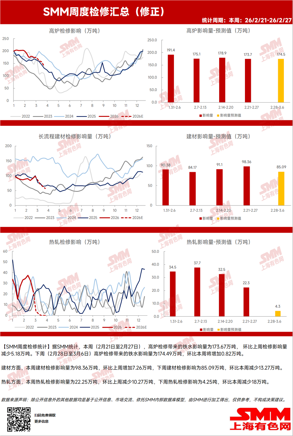 【SMM周度检修统计】据SMM统计,本周(2月21日至2月27日),高炉检修带来的铁水影响量为173.67万吨, 环比上周检修影响量减少5.18万吨。下周(2月28日至3月6日)高炉检修带来的铁水影响量为174.49万吨,环比本周将增加0.82万吨。