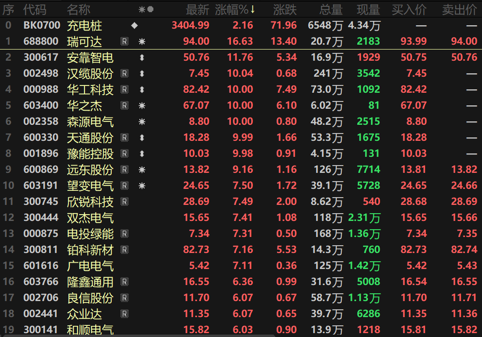 SMM 2月24日讯:2026年春节归来后的首个交易日,充电桩板块盘中走高,指数涨逾2%。个股方面,瑞可达涨逾16%,安靠智电涨逾11%。=汉缆股份、华工科技、华之杰、豫能控股等6股涨停,远东股份、望变电气等多股涨逾7%。