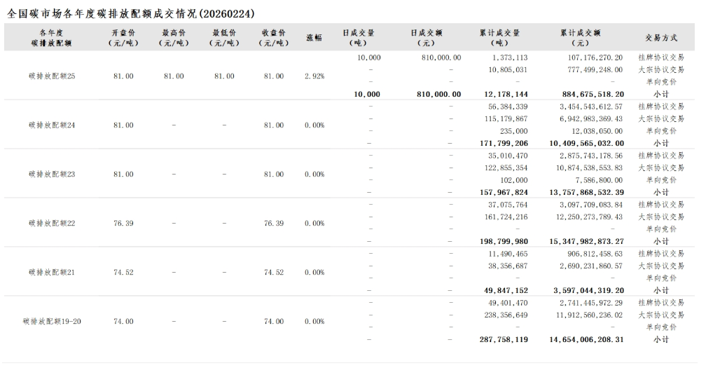 截至2026年2月24日,全国碳市场碳排放配额累计成交量878,350,425吨,累计成交额58,651,142,483.37元。