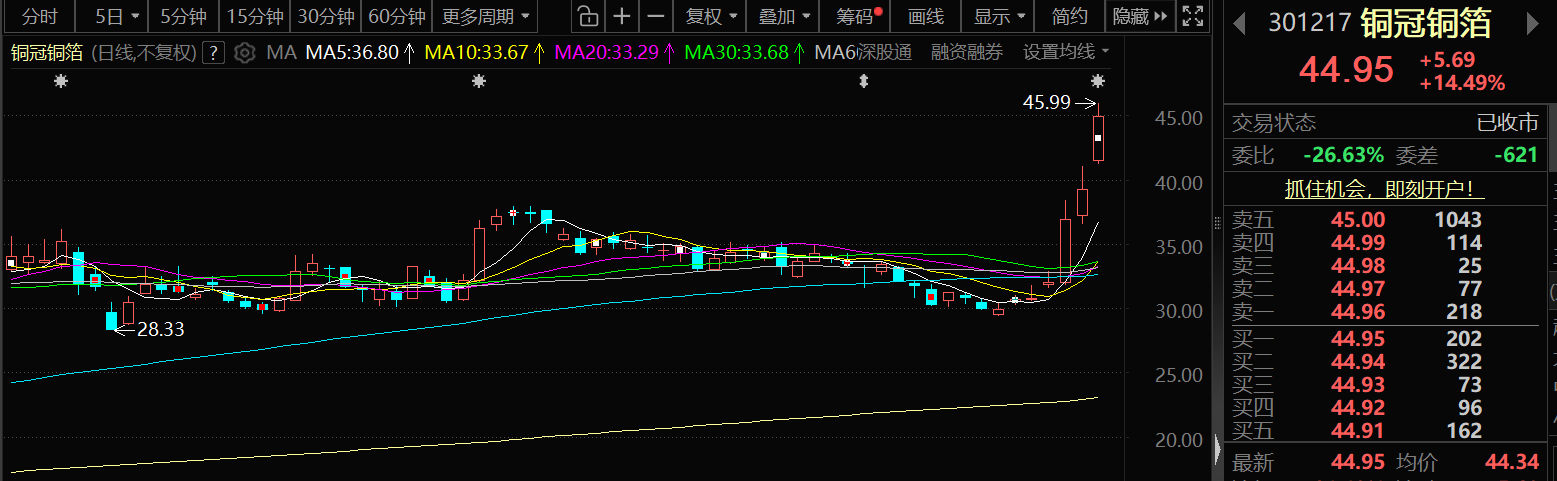 2月24日,铜冠铜箔股价出现上涨,截至24日收盘,铜冠铜箔涨14.49%,报44.95元/股。