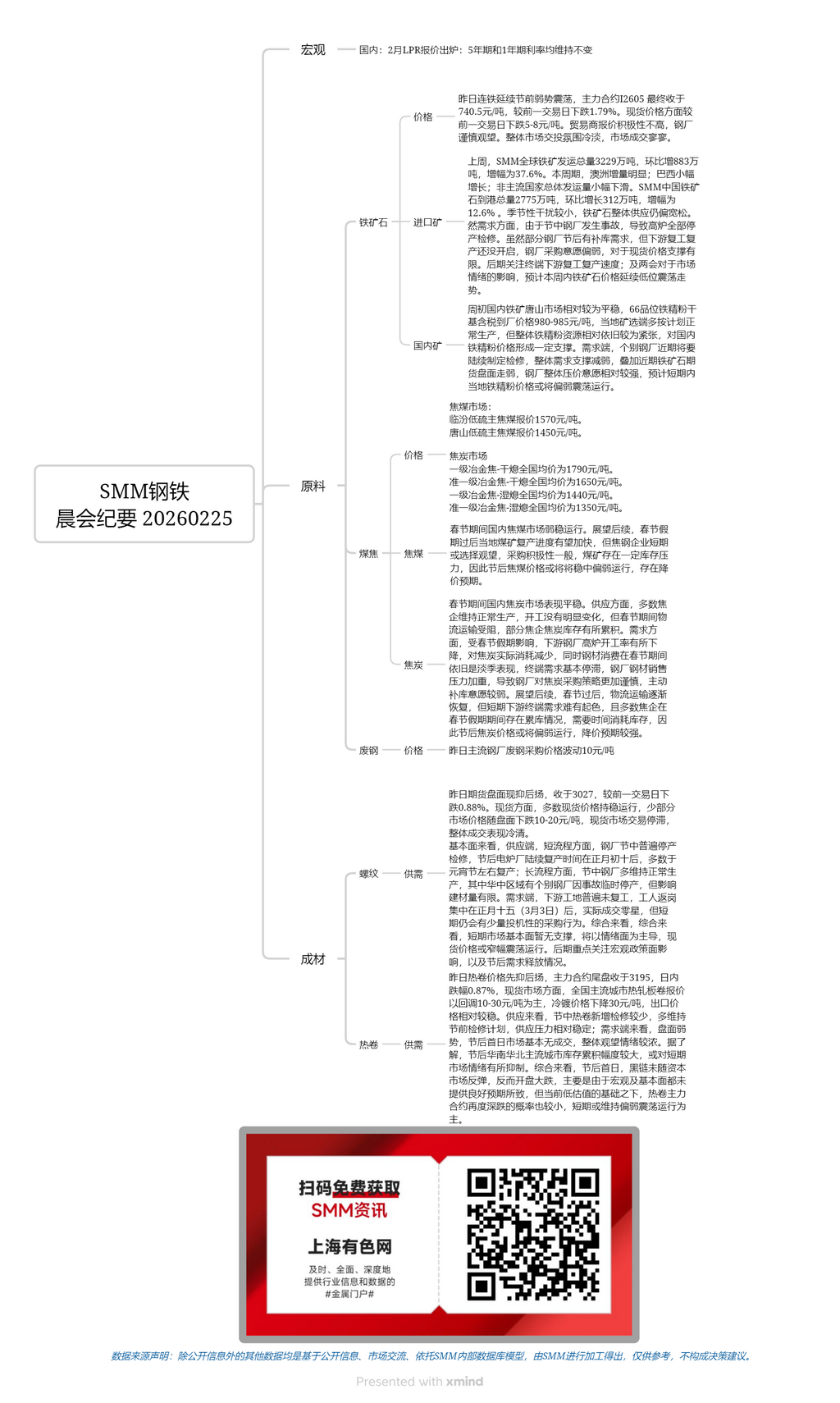 基本面来看,供应端,短流程方面,钢厂节中普遍停产检修,节后电炉厂陆续复产时间在正月初十后,多数于元宵节左右复产;长流程方面,节中钢厂多维持正常生产,其中华中区域有个别钢厂因事故临时停产,但影响建材量有限。需求端,下游工地普遍未复工,工人返岗集中在正月十五(3月3日)后,实际成交零星,但短期仍会有少量投机性的采购行为。综合来看,综合来看,短期市场基本面暂无支撑,将以情绪面为主导,现货价格或窄幅震荡运行。后期重点关注宏观政策面影响,以及节后需求释放情况。