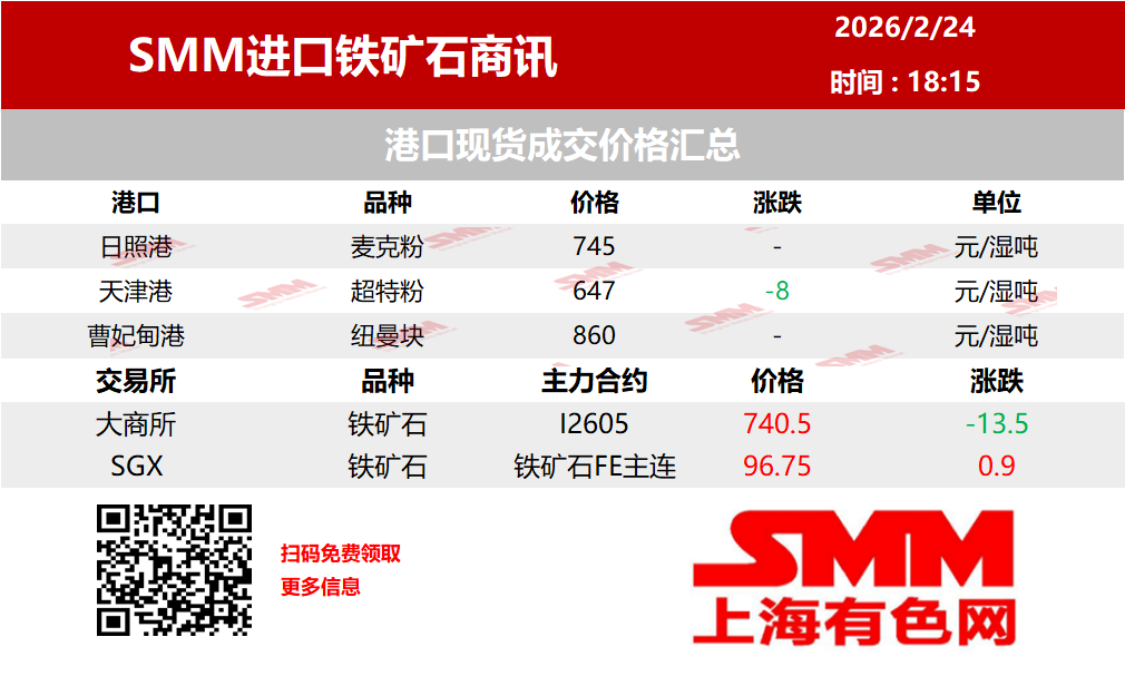 【SMM铁矿价格】今日铁矿石价格较节前下降5-10元。山东主要港口麦克粉745元,天津港超特粉647元,河北港口纽曼块860元【SMM铁矿】