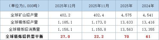 2025年12月全球铅市为供应过剩2.70万吨,上个月为供应过剩2.22万吨。由于产量增长高于需求增速,2025年全球铅市供应过剩量扩大至7.0万吨,2024年为供应过剩6.1万吨。